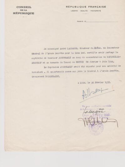 DO156 – Frédéric Jouffrault – Attestation de déportation pour faits de résistanceadmin2026-01-11T10:06:23+01:00 Télécharger le document (jpg) FacebookXLinkedInWhatsAppEmail
