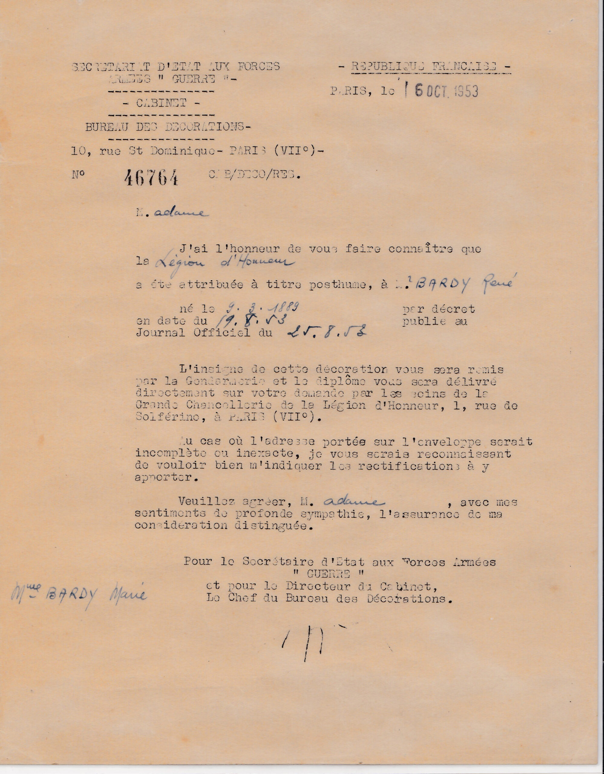 Il est promu à titre posthume au grade de Capitaine, par décret du 5 juin 1944, avec effet au 1er août 1943.